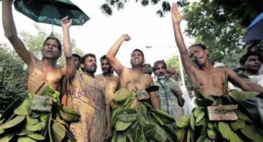 هنود يرتدون ملابس من الخيش وورق الشجر خلال تظاهرة احتجاج على ارتفاع أسعار السلع الرئيسة في نيودلهي.