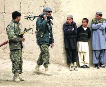أطفال ينظرون إلى جنديين أفغانيين. أ.ب