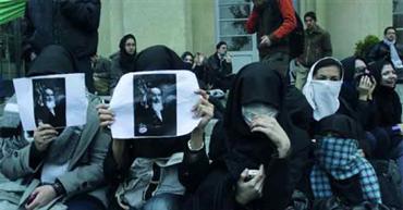 معارضات إيرانيات يخبّئن وجوههن خلف صور الخميني لتحاشي التعرف إلى ملامحهن. أ.ب