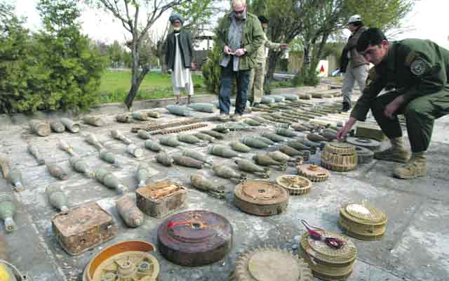 مسؤولون أمنيون أفغان يتفقدون الذخائر التي عُثر عليها في هيرات. إي.بي.إيه