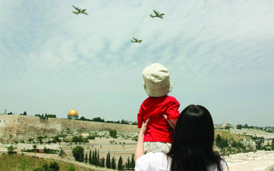 فلسطينية تري طفلها قبة الصخرة من مسافة بعيدة. إي.بي.إيه