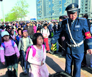 أطفال صينيون في صحبة الشرطة بعد الحادث. إي.بي.إيه
