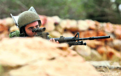 جندي إسرائيلي يتخذ وضعية إطلاق النار على متظاهري بلعين. أ.ب