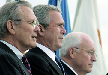 بوش (وسط) ونائبه تيشيني (يمين) ووزير دفاعه رامسفيلد بحثوا غزو العراق بعد ساعات من اعتداءات 11 سبتمبر. أي.بي.أيه