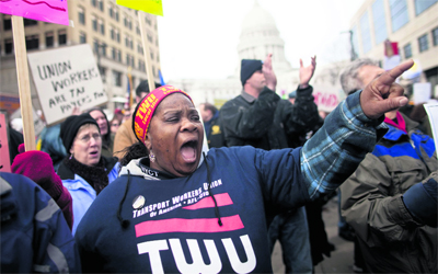 نظم عشرات الآلاف احتجاجاً في ولاية ويسكونسن الاميركية، أول من أمس، ضد حملة لحكومة الولاية للحد من قوة اتحادات القطاع العام، ما أثار تجمعات تضامنية لحقوق العمال في شتى انحاء الولايات المتحدة. ويرى محتجون هذه المقترحات على أنها محاولة لإضعاف الحركة العمالية، بينما قال مراقبون إنها استلهمت ثورتي مصر وتونس.