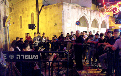 وفي باب العمود كانت العروض متحركة على كامل الواجهة الرئيسة للباب مع أصوات الموسيقى، وفي الطريق إلى باب الجديد المسمى إسرائيلياً «تسنحنيم» كانت فرقة «ملائكة السلام» تؤدي عرضا يجمع بين التاريخ والفلسفة بإضاءة خافتة وموسيقى هادئة.