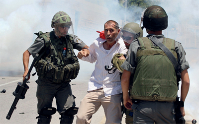 جنود الاحتلال يقبضون على متظاهر فلسطيني ضد توسيع المستوطنات في قرية النبي صالح. أ.ف.ب