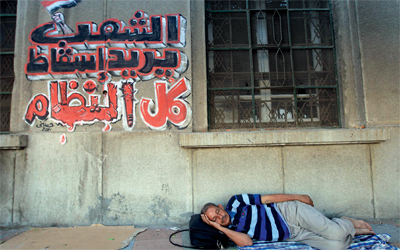 مصري من عامة الشعب نائم تحت رسم ينادي بإسقاط نظام مبارك. أ.ف.ب