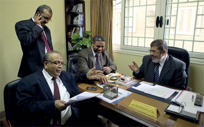 قادة «الحرية والعدالة» يتابعون المعركة الانتخابية. أ.ف.ب