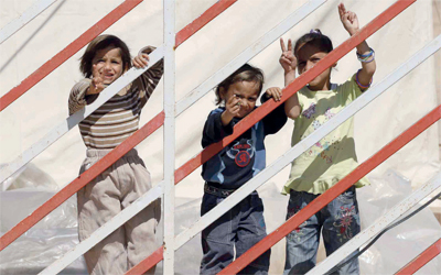 أطفال سوريون يرفعون شارة النصر بمخيم للاجئين في إقليم هاتاي التركي. رويترز