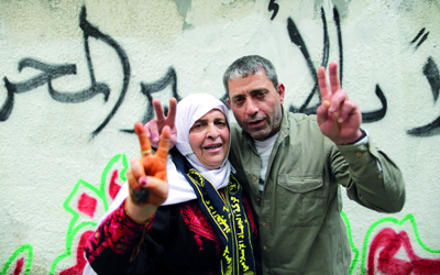بارود ووالدته يرفعان شارة النصر عقب الإفراج عنه. الإمارات اليوم