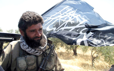 مقاتل معارض للأسد يحمل الراية الإسلامية خلال معارك ضد القوات النظامية في محافظة إدلب. رويترز