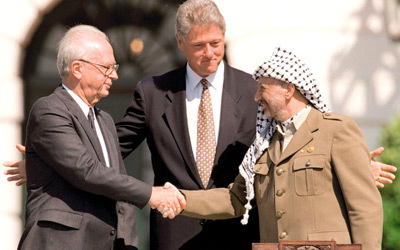 وفي سبتمبر من عام 1993، قام الرئيس (الأميركي السابق) بيل كلينتون برعاية مصافحة بين رئيس الوزراء الإسرائيلي الراحل، إسحق رابين، والرئيس الفلسطيني الراحل زعيم منظمة التحرير الفلسطينية آنذاك، ياسر عرفات، في حديقة البيت الأبيض.