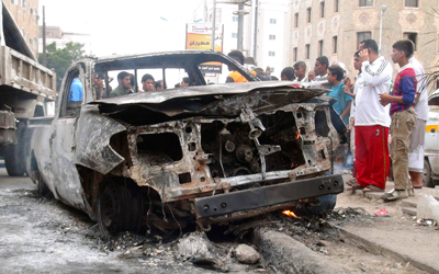 يمنيون حول سيارة محترقة بعد التفجير الذي استهدف سيارة للشرطة في عدن. رويترز