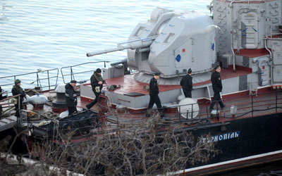 جنود وضباط روس يدخلون على متن سفينة تابعة للبحرية الأوكرانية ميناء سيفاستوبول. أ.ف.ب