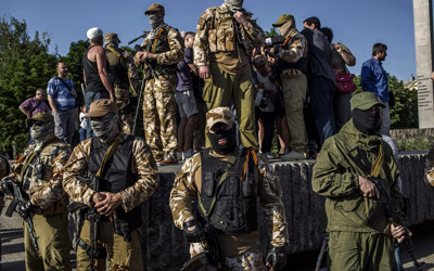 ميليشيات موالية لروسيا خلال تظاهرة ضد كييف في بلدة يونستك الأوكرانية. أ.ف.ب