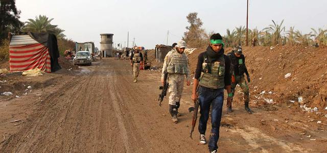 مقاتلون موالون للحكومة العراقية يدخلون إلى قضاء بلد شمال بغداد خلال عملية انتشار أمني مكثف ضد تنظيم «داعش». رويترز