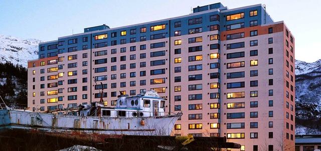 يشتكي كثيرون الازدحام في المدن الأميركية، إلا أن الأمر لا يشغل اهتمام سكان قرية «ويتير» في ولاية ألاسكا. فجميع سكان القرية، تقريباً، يقطنون في بناية واحدة وسط المناظر الطبيعية الخلابة. لكن تجمعهم في مكان واحد يجعل فصل الشتاء -الطويل في الشمال- أقل صعوبة. ويوجد في المبنى المتواضع نحو 200 شخص، يزاول عدد منهم أعمالهم من المنزل، في حين يذهب الأطفال إلى المدرسة الصغيرة القريبة من السكن كل صباح. والمجمع السكني كان في الماضي عبارة عن ثكنة عسكرية تابعة للجيش الأميركي.