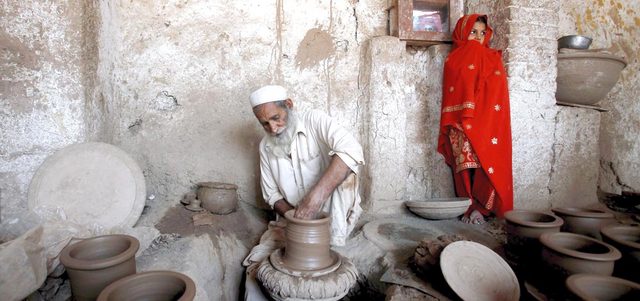 صانع فخار في ورشته في مدينة بيشاور وبجانبه حفيدته. ويعاني عدد كبير من الباكستانيين الفقر وقلة فرص العمل.