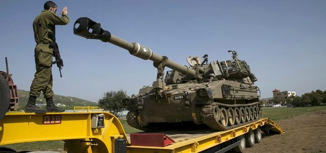 جندي إسرائيلي يوجه وحدة مدفعية متنقلة في قرية بقعاثا ضمن تعزيزات أرسلتها تل أبيب إلى هضبة الجولان المحتلة. رويترز