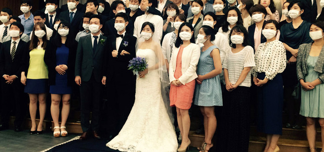 تداول رواد مواقع التواصل الاجتماعي صوراً لحفل زفاف في كوريا الجنوبية، ارتدى خلاله جميع الحضور أقنعة طبية واقية، بما في ذلك العريس والعروس. وتبين لاحقاً أن الأمر كان مجرد مزحة. وظهر في الصور زوجان يضعان كمامتين طبيتين، وهما محاطان بعشرات الأشخاص، وضع جميعهم أقنعة بيضاء على أفواههم، في إشارة إلى الاحتياطات ضد العدوى بمرض «فيروس كورونا» الذي تفشى في البلاد أخيراً.