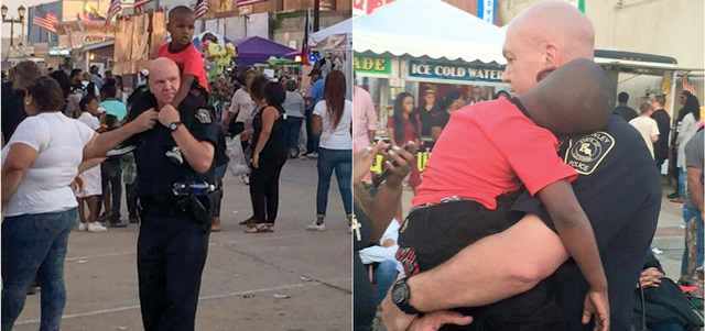 شرطي أميركي يحمل طفلاً ضائعاً على كتفيه باحثاً عن أهله
