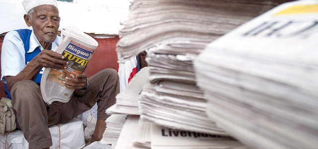 بائع صحف يفرز أعداداً كبيرة من الصحف المختلفة بعد وصولها، صباح أمس، بوساطة العبارة من البر، إلى جزيرة مدينة الحجارة التي تتمتع بحكم ذاتي بزنجبار في تنزانيا.