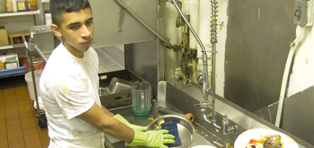 أحد المهاجرين يغسل الأطباق في مطعم. أرشيفية