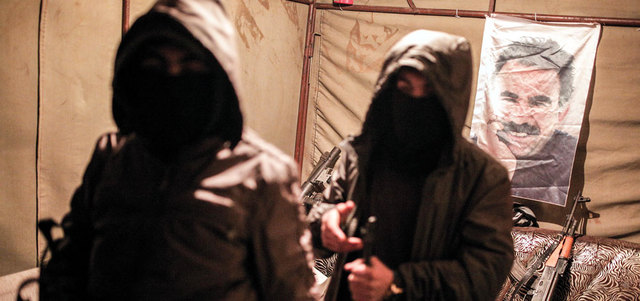 ميليشيات من حزب العمال الكردستاني في أحد التحصينات وفي الخلفية تظهر صورة الزعيم الكردي عبدالله أوجلان. أ.ب