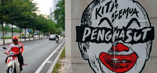 رجل يقود دراجته في كوالالمبور بجانب جدار رسم عليه رأس مهرج. وقد وجّهت تهمة لفنان ماليزي بالسخرية من رئيس الوزراء الماليزي، نجيب رزاق، الأمر الذي يُعد خرقاً لقانون النشر والإعلام في ماليزيا.