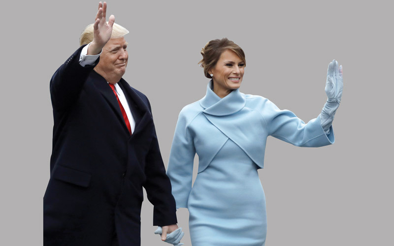 خرج الرئيس الأميركي الجديد، دونالد ترامب، وزوجته ميلانيا، ونجلهما بارون، لفترة وجيزة من السيارة الرئاسية، أول من أمس، في واشنطن من أجل إلقاء التحية على الحشود في شارع بنسلفانيا، بين مبنى الكابيتول والبيت الأبيض.