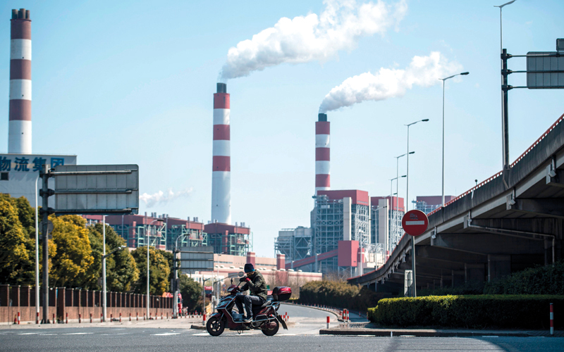 رجل يقود دراجته النارية بالقرب من محطة «وايغاكيو» لتوليد الطاقة الكهربائية في شنغهاي. وتعمل المحطة بالفحم الحجري الذي يعد مسبباً رئيساً لتلوث الهواء. وشهدت الصين مستويات عالية من التلوث في السنوات الأخيرة.