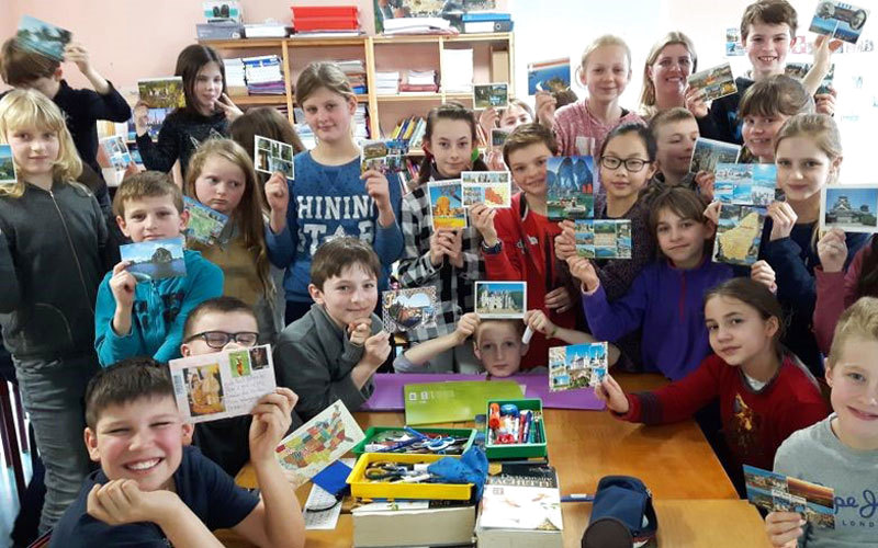 طلاب مدرسة يتلقون بطاقات من أنحاء العالم