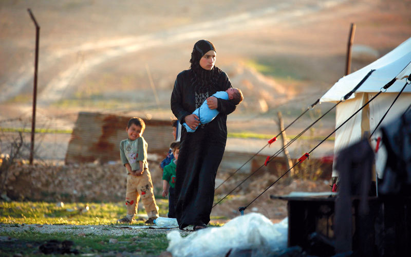 نازحة سورية تحمل طفلها في مخيم للاجئين في قرية عين عيسى، حيث تجمع الفارون من الرقة التي يسيطر عليها المتطرفون.