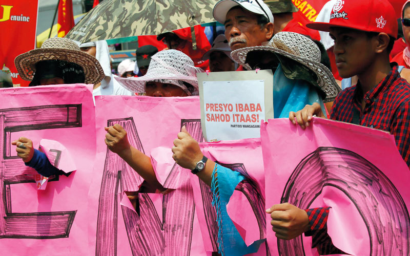 عمال محتجون يحطمون، رمزياً، ما يسمى «إندو» أو نظام التعاقد، خلال مسيرة بالقرب من القصر الرئاسي للاحتفال بعيد العمال في مانيلا. ويطالب هؤلاء بزيادة الأجور وإنهاء العمل بهذا النظام. أ.ب