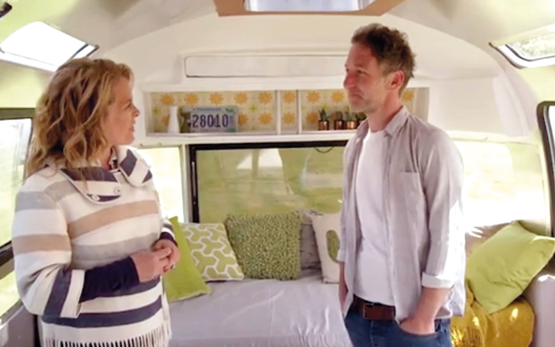 توم يتحدث مع صحافية داخل منزله المتنقل. أرشيفية