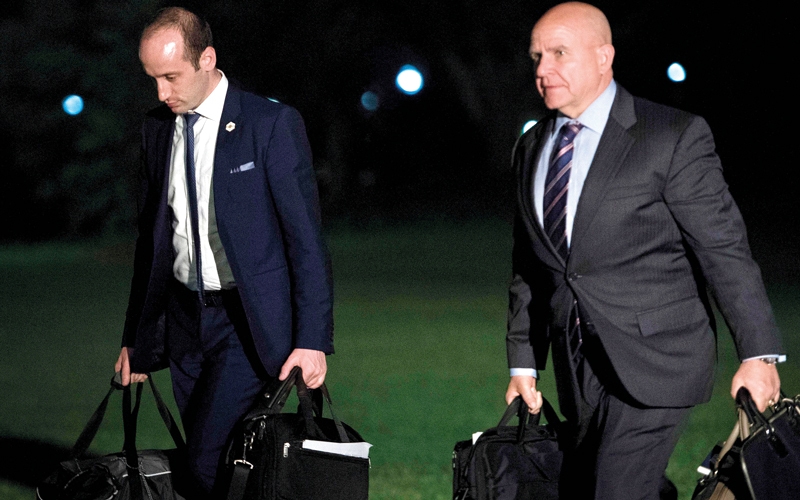مستشار البيت الأبيض ستيفن ميلر (يسار) ومستشار الأمن القومي هربرت رايموند ماكماستر لدى عودتهما إلى البيت الأبيض الليلة قبل الماضية بعد أن رافقا الرئيس في جولتيه إلى الشرق الأوسط وأوروبا. أ.ف.ب
