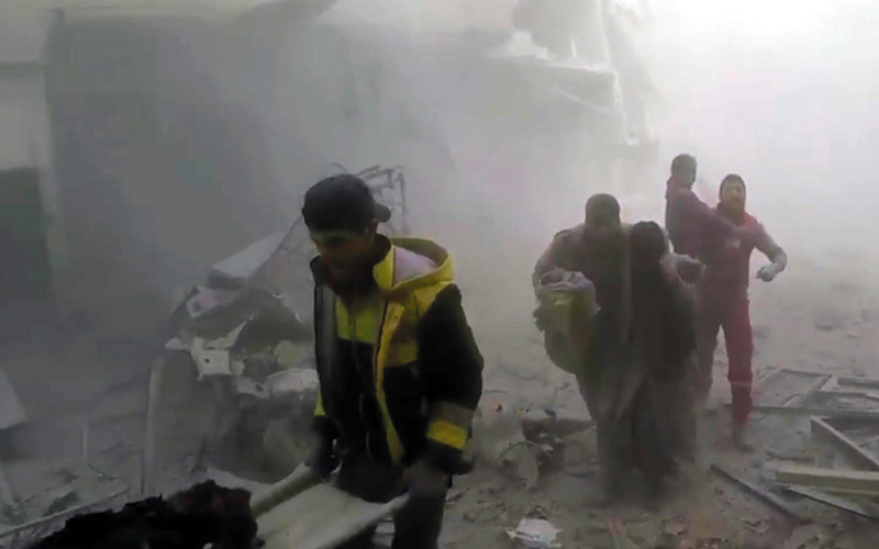 - الغوطة الشرقية في التاسع من فبراير: تقدمت السويد والكويت بمشروع قرار جديد يدعو إلى وقف اطلاق النار لمدة 30 يوماً في سورية، ورفع الحصار الذي يفرضه المتحاربون، خصوصاً قوات النظام في مناطق عدة.