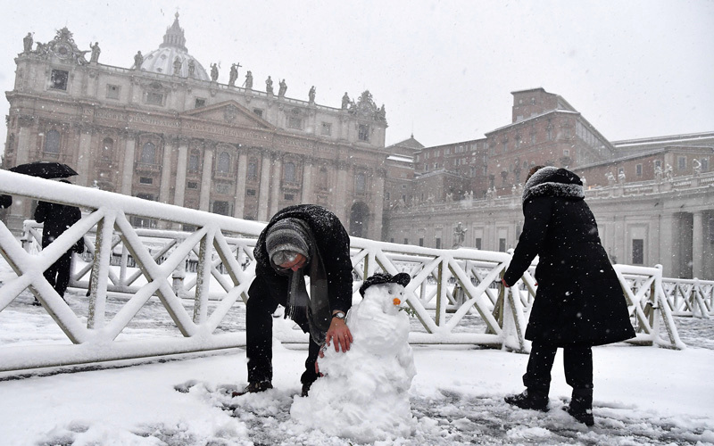 شخصان يشكلان رجل ثلج بساحة القديس بيتر في الفاتيكان حيث تشهد أوروبا موجة برد شديدة هذه الأيام.