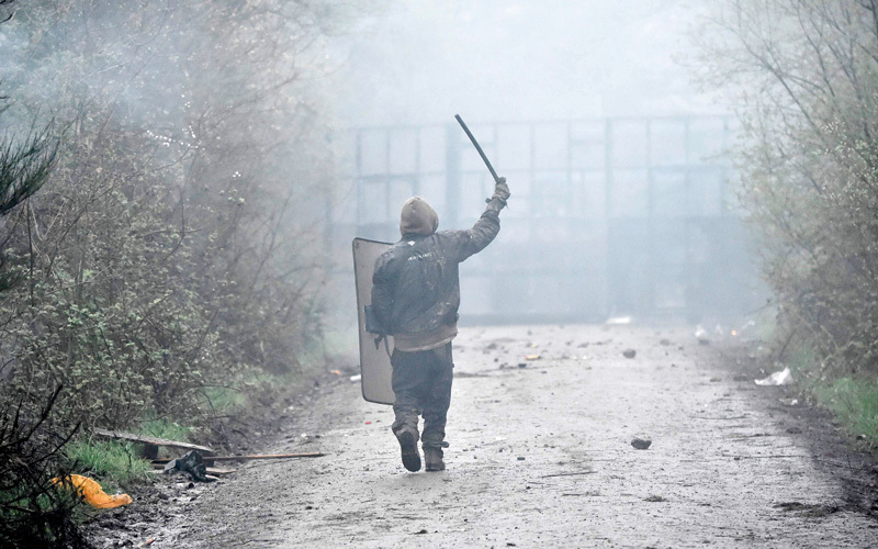 متظاهر يحمل درع شرطة مكافحة الشغب وهراوة، في مواجهة رجال الشرطة الفرنسية، الذين جاؤوا لإخلاء المنطقة من الناشطين البيئيين، من الموقع المعروف باسم «منطقة تحتاج للحماية»، والذي سيكون مكان المطار الجديد المقترح.