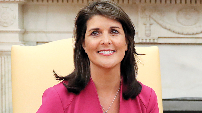 يبدو أن رئيس الوزراء الإسرائيلي، بنيامين نتنياهو، حزين لرؤية نيكي هالي وهي تستعد لحزم أمتعتها لتغادر منصبها كسفيرة أميركا في الأمم المتحدة بنهاية العام، بينما يتنفس الفلسطينيون الصعداء. فقد ظل نتنياهو يشيد بهالي ويكيل لها المديح لمواجهتها ما سمّاه «رياء» الأمم المتحدة، ولكفاحها «من أجل إسرائيل». وفي الوقت ذاته تصف القيادة الفلسطينية موقف هالي المؤيد لإسرائيل بأنه «مروع» لعملية السلام، وعبّر الفلسطينيون عن ارتياحهم لمغادرتها المزمعة لمنصبها.