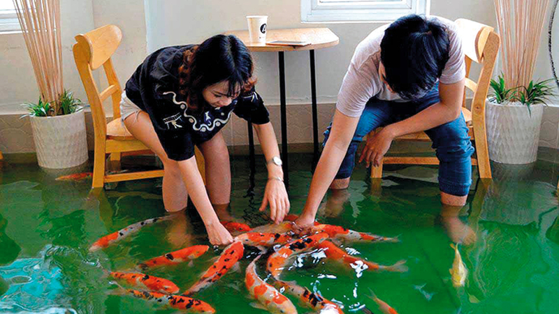 وسط مدينة «هو شي منه» الفيتنامية، يوجد مقهى فريد من نوعه، فهو يتكون من طابقين كليهما مغمور بالمياه ومملوء بالمئات من الأسماك الصغيرة والمتوسطة، وقد صمم بطريقة لا تسمح للماء بالتسرب، إذ استخدم لهذا الغرض نوع من البلاستيك القوي، كما تم لف أرجل الطاولات والكراسي بالقطن لتقليل الاحتكاك ومنع تلف الأثاث، ويصل مستوى المياه إلى 25 سنتيمتراً. ومن أجل الوصول إلى هذه «البركة» المملوءة بالأسماك الملونة، يتعين على الزبائن والزوّار خلع أحذيتهم وتنظيف أقدامهم، ويمكنهم بعد ذلك الاستمتاع بمجموعة كبيرة من المرطبات والوجبات الخفيفة، بينما يسبح سمك الشبوط والأسماك الصغيرة الأخرى بين أقدامهم.