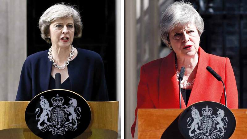 صورة مركبة لماي في اليوم الأول لتوليها رئاسة الوزراء (يسار).. والأخرى يوم إعلان مغادرتها. أ.ب