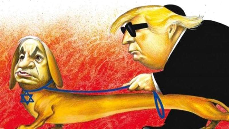 ويظهر رئيس الوزراء الإسرائيلي في الكاريكاتير على هيئة كلب إرشاد، يرتدي قلادة لنجمة داود، بينما يقيّده الرئيس الأميركي الذي يبدو كفيفاً ويضع على رأسه قلنسوة.