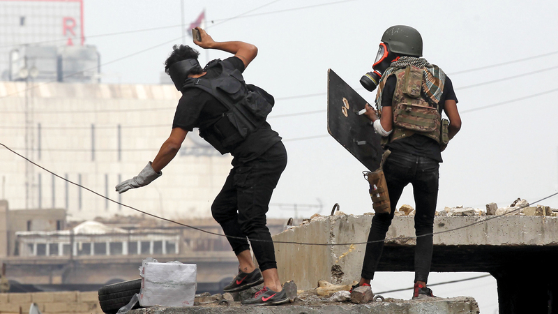 متظاهرون عراقيون يشتبكون مع قوات الأمن. أ.ف.ب