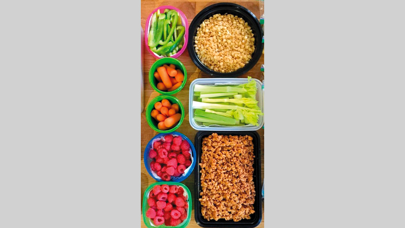 - تُظهر الصورة شطيرتين كبيرتين وثلاث قطع من مخبوزات الحبوب، وكعكتين صغيرتين وموزتين وحبة خيار وكيساً كبيراً من العنب والتفاح والجزر، وغيرها.