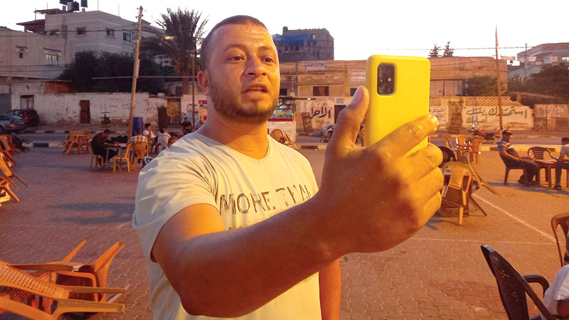 مخاطبة الأمواتالتقت «الإمارات اليوم» إبراهيم في متنزه البلدية في مدينة خان يونس جنوب القطاع، حيث كان يتجول بين المواطنين ليتلمس أوجاعهم، من أجل بثها عبر منصته الإلكترونية، لتصل إلى جميع رواد مواقع التواصل الاجتماعي في العالم.