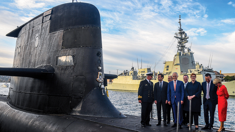 الرئيس الفرنسي ورئيس حكومة أستراليا في أحد موانئ سيدني إضافة إلى مسؤولين آخرين في عام 2018. غيتي