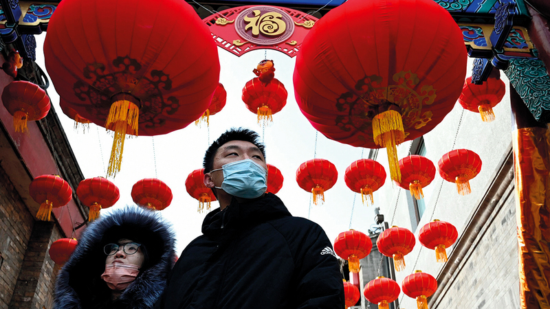 صينيون يسيرون تحت حبال زينة تحمل صفوفاً من المصابيح التقليدية في العاصمة الصينية بكين، قبل يوم واحد من بدء العام القمري الجديد «عام النمر».