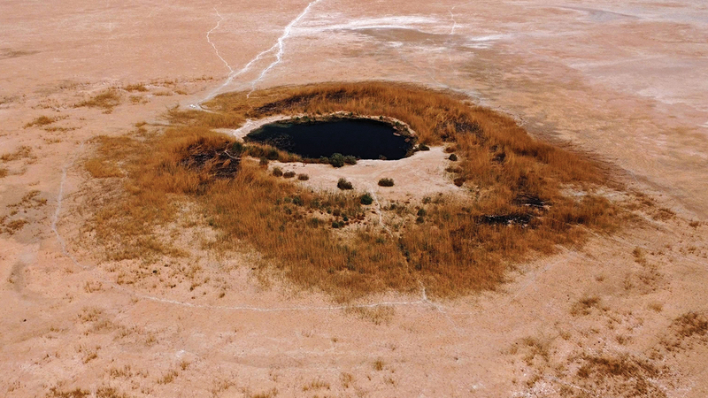 • لم يتبقَّ من البحيرة سوى أراضٍ رملية مغطاة بالملح الأبيض، وبركة صغيرة تسبح فيها أسماك فوق العين التي تربط البحيرة بمنبعها من المياه الجوفية.